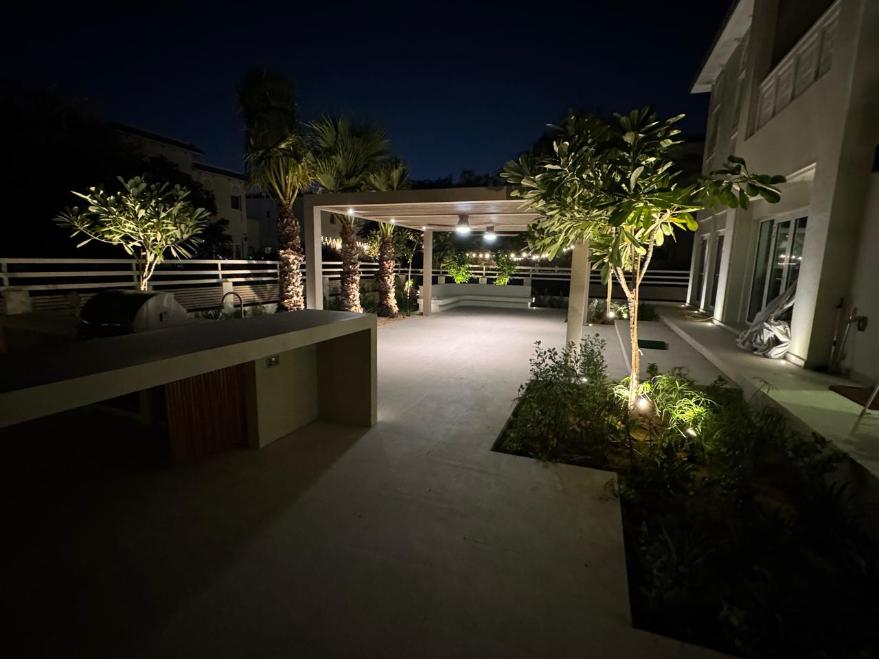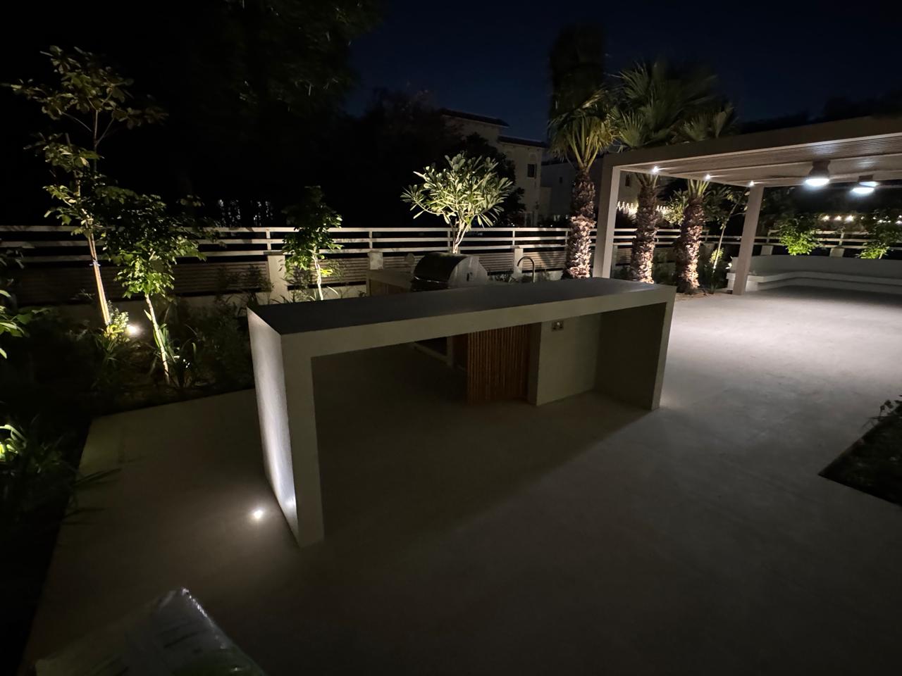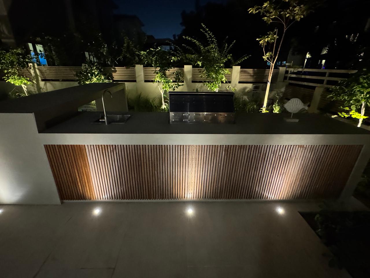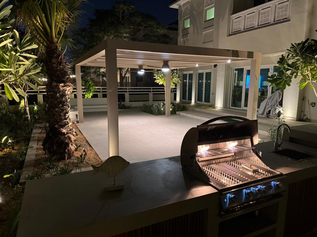 At the heart of the garden, a sleek shade structure offers a serene dining area, while the modern L-shaped BBQ and bar counter seamlessly blend style and functionality—bringing the entire space together as a cohesive, luxurious outdoor experience.