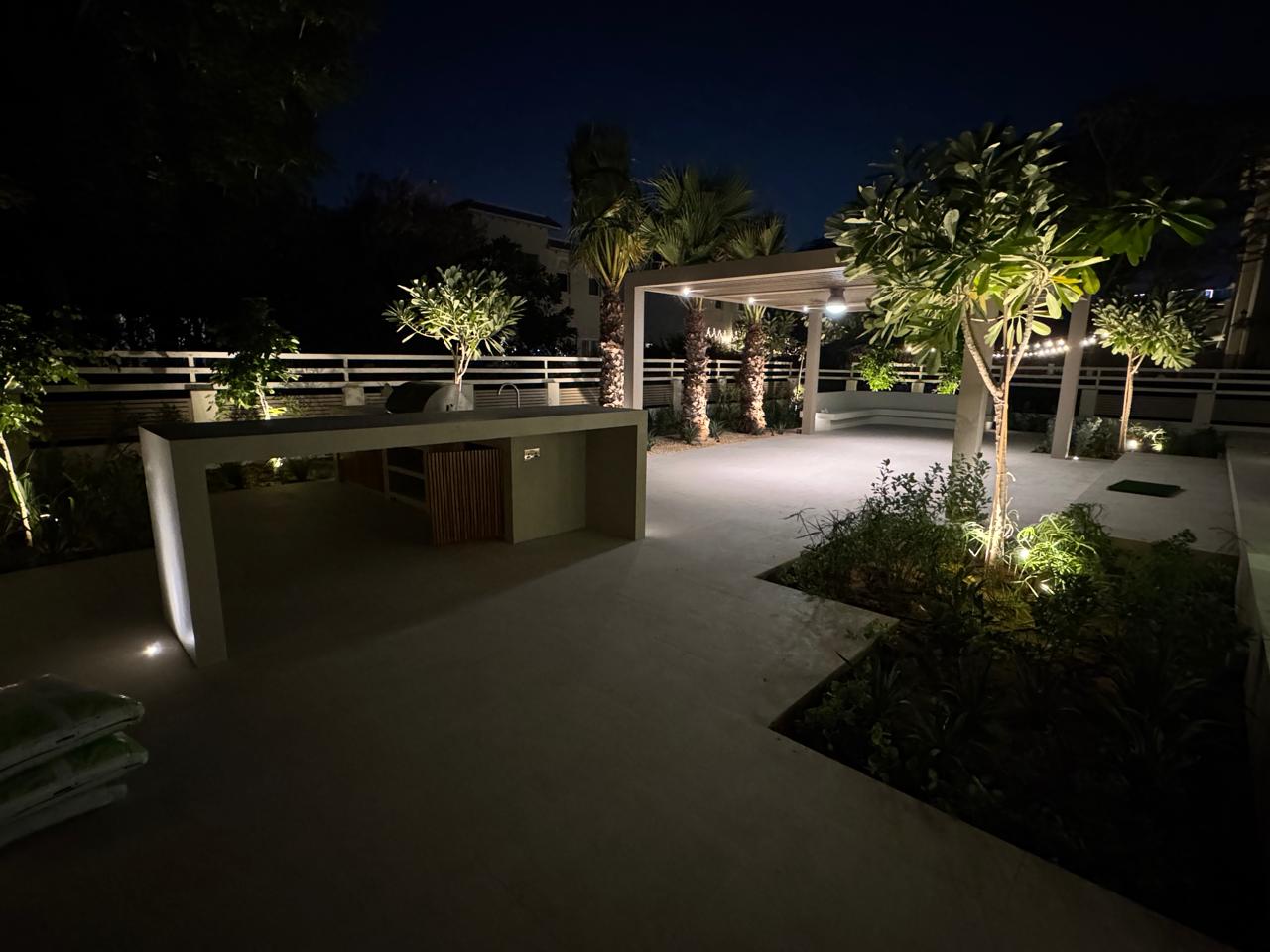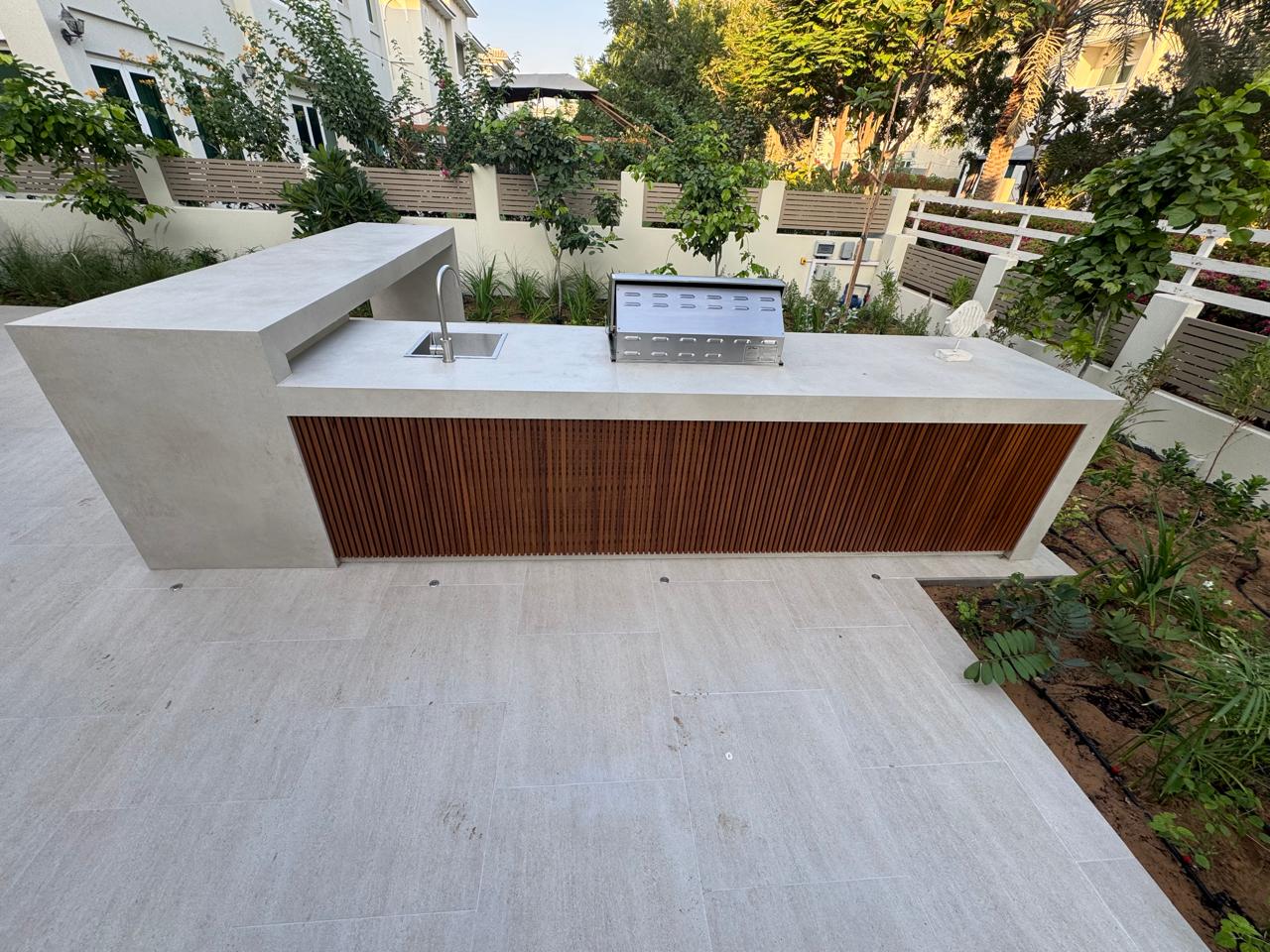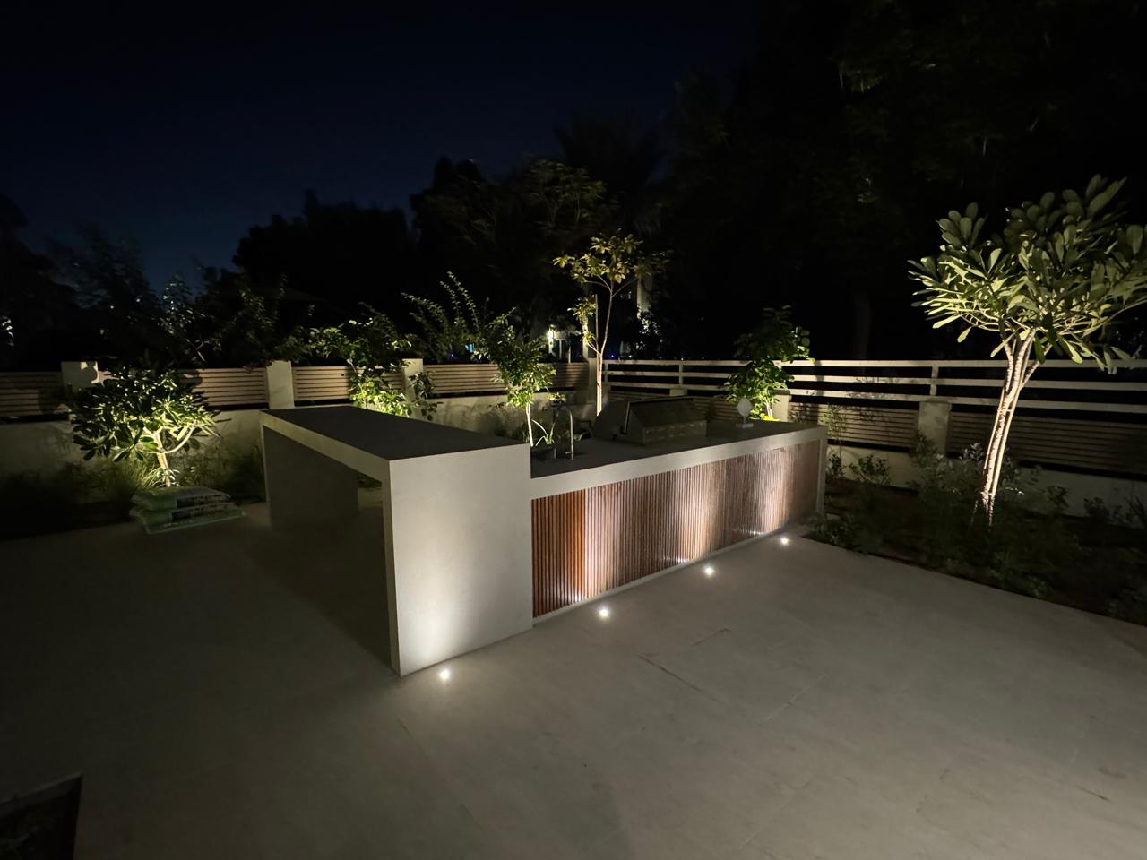 At the heart of the garden, a sleek shade structure offers a serene dining area, while the modern L-shaped BBQ and bar counter seamlessly blend style and functionality—bringing the entire space together as a cohesive, luxurious outdoor experience.