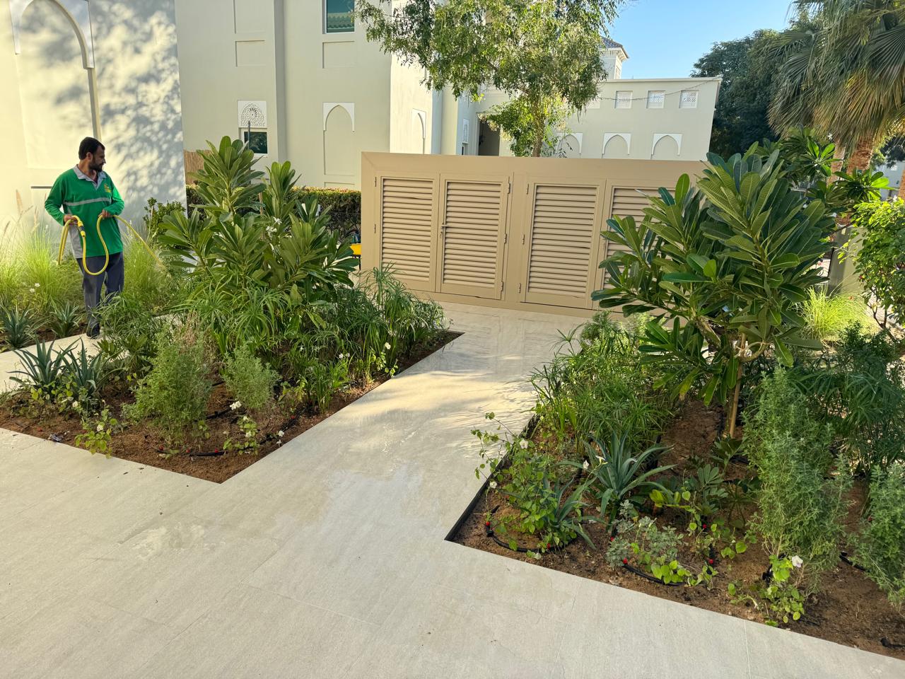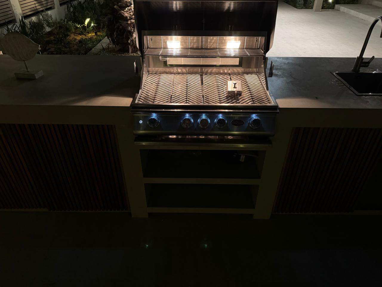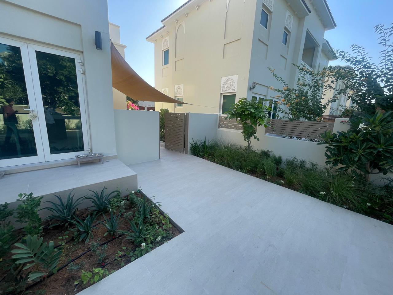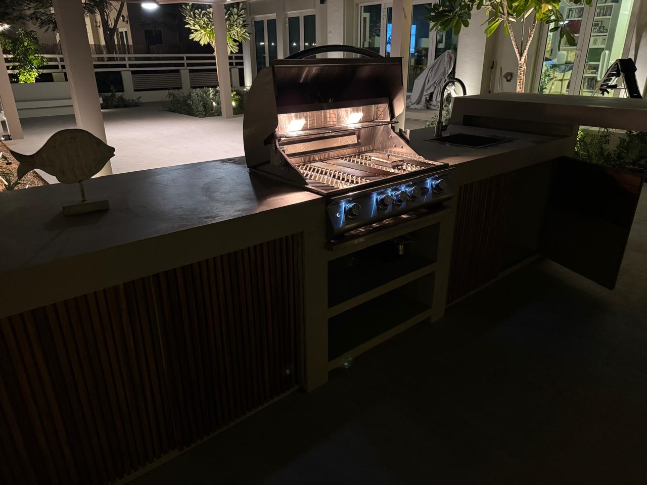 At the heart of the garden, a sleek shade structure offers a serene dining area, while the modern L-shaped BBQ and bar counter seamlessly blend style and functionality—bringing the entire space together as a cohesive, luxurious outdoor experience.